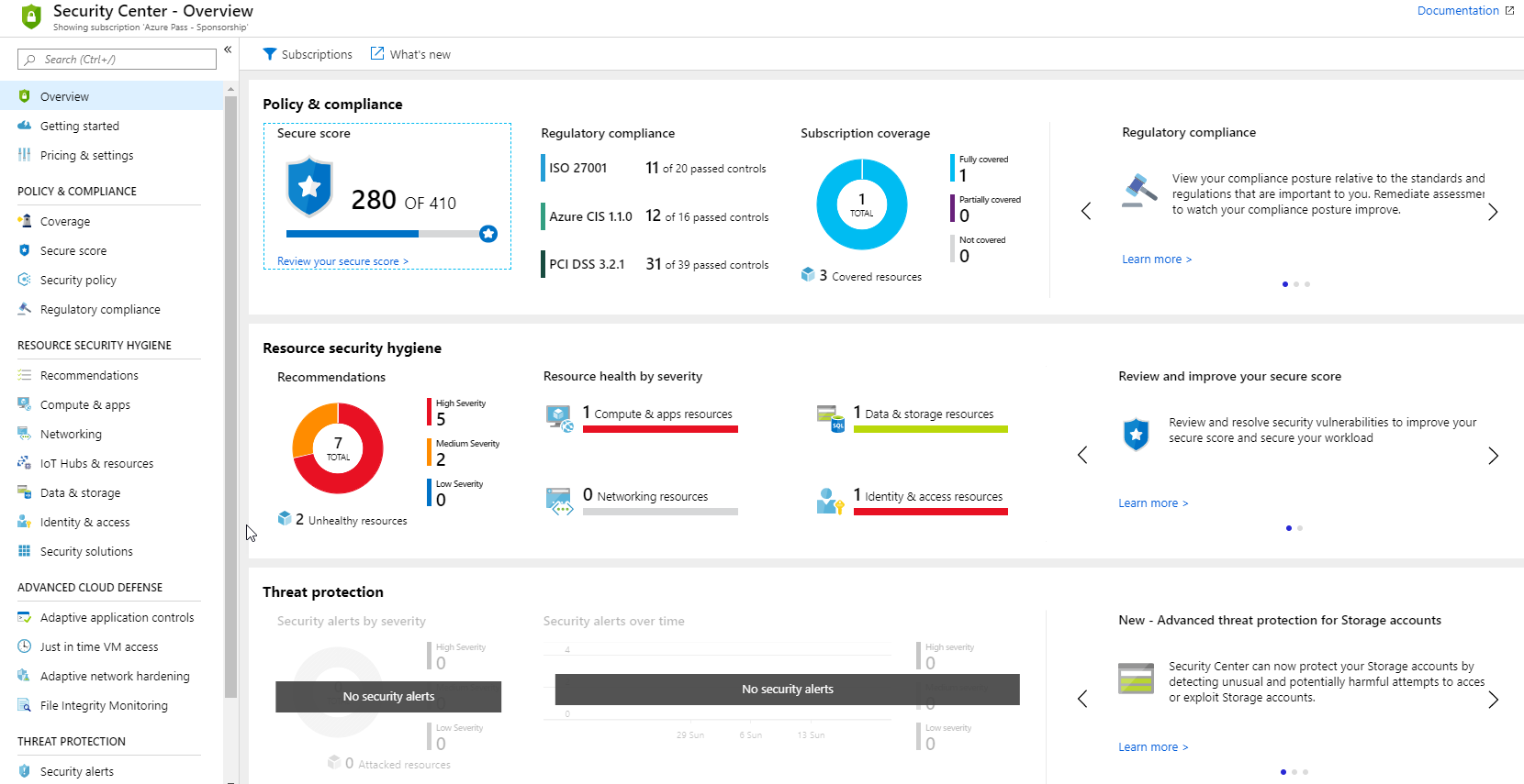 Azure Portal에서 보안 센터의 개요블레이드를 탐색합니다.